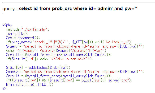 $query = "select pw from prob_orc where id='admin' and pw='{$_GET[pw]}'";